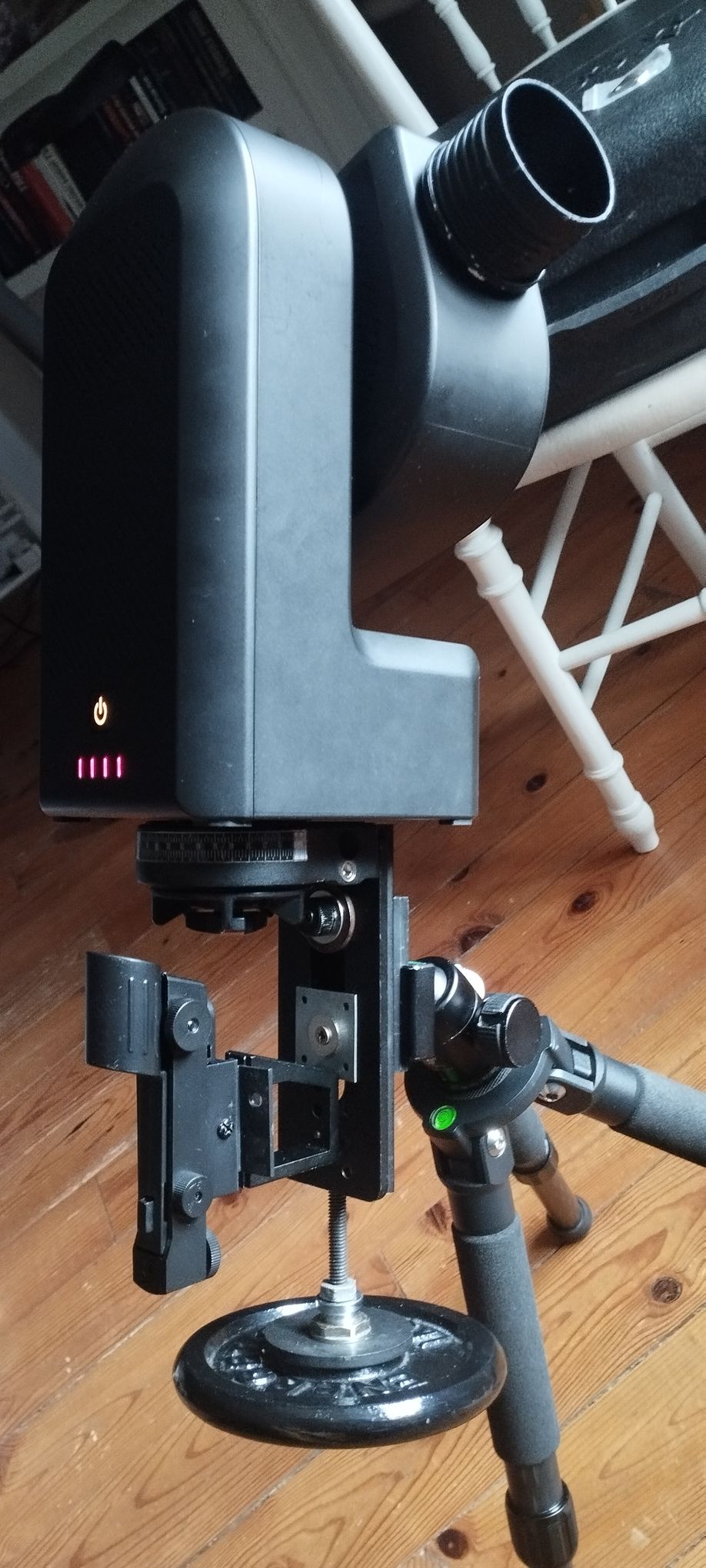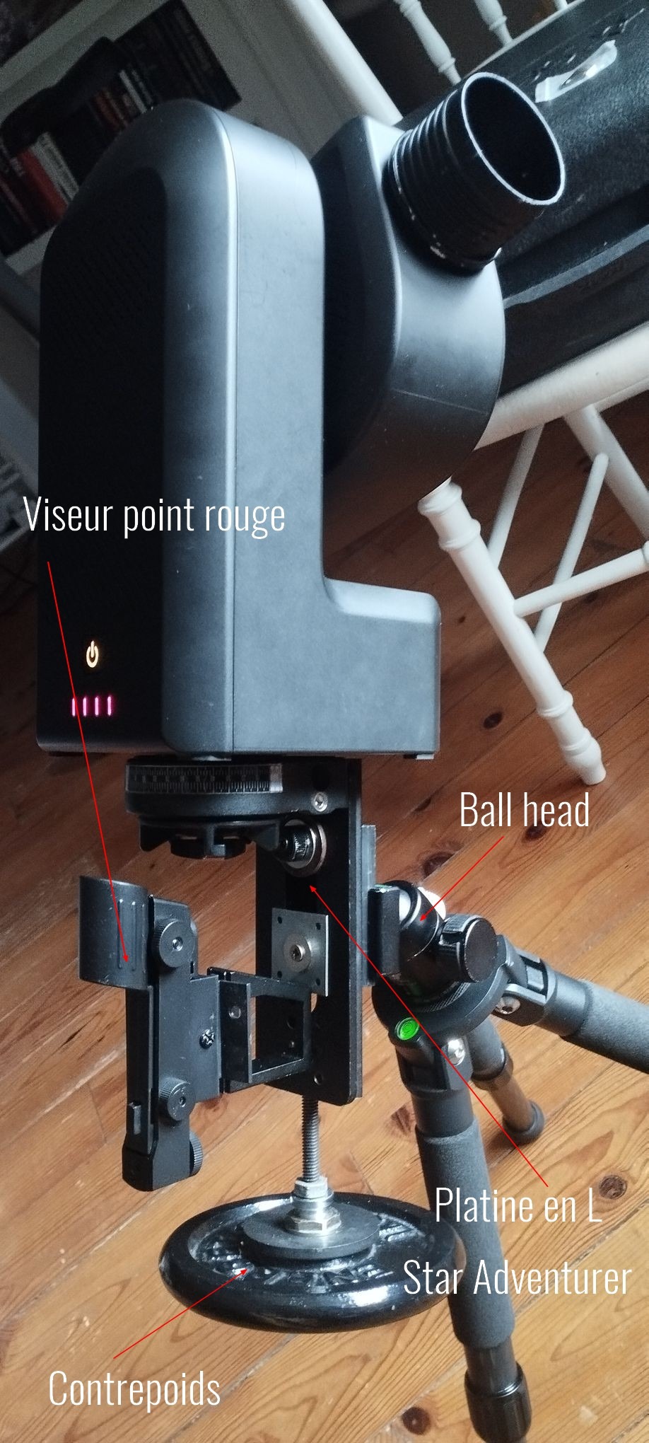 Ensuite, grâce à un petit bricolage, on adapte la platine de la rotule photo sur le support en L pour monture « Star Adventurer » (une quarantaine d’euros). J’y ai ajouté un contrepoids ainsi qu’un petit viseur point rouge pour dégrossir la mise en station avant d’y visser le Seestar.