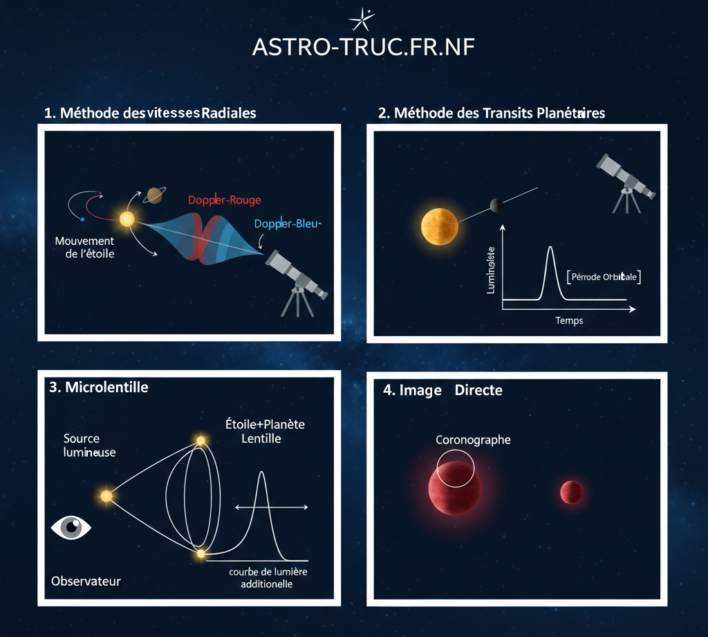 La découverte et la caractérisation des milliers d’exoplanètes connues à ce jour n’auraient pas été possibles sans un arsenal de techniques ingénieuses. Directement invisibles à l’œil nu et même aux télescopes les plus puissants (en raison de leur petite taille et de la luminosité écrasante de leur étoile), les exoplanètes sont principalement détectées par les effets qu’elles produisent sur leur étoile hôte ou sur la lumière de cette étoile. Explorons les méthodes les plus fructueuses de cette passionnante chasse aux mondes lointains.